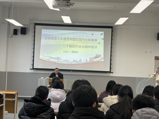 本次宣讲紧扣二十四届四中全会核心要义,围绕中国式现代化的内涵要求、新时代新征程的使命任务,结合高等教育与语言文学系专业特色,系统解读了全会提出的新思想、新论断、新部署。宣讲过程中,既有对全会精神的理论阐释,也有结合学科育人实践的案例分析,引导全体党员深刻把握“教育强国、文化强国”建设与专业发展的结合点,明确在人才培养、科学研究、社会服务中践行全会精神的具体路径。